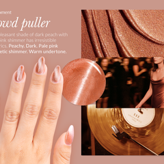 Peachy. Dark. Pale pink magnetic shimmer. Opaque. Warm undertone.